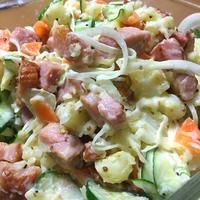 簡単! 具沢山でボリュームたっぷり! サラダとしてだけでなく、メインにもなるほどゴロゴロと具材が入っています! 厚切りベーコンを使用しているので、存在感たっぷりです! すぐに作れるので、ぜひ試してみてください!