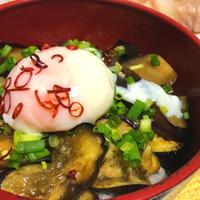 温泉卵用意するのが面倒だったので生卵で。多分ナスだけの場合は味が濃いめだと思います!
