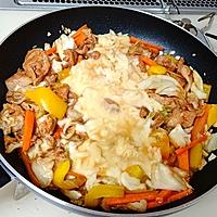 - 5 軽く火が通ったら3を加えて中火で炒めます。お肉に火が通ったら両端に分け、中央にピザ用チーズとモッツァレラチーズを入れます。