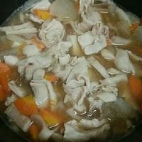 - 5 2と3を入れて中火で5分ほど煮ます。豚バラ肉に火が通ったら塩で味を調え、しょうゆを回し入れます。