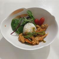 - 7 お皿に6、添え物を盛り付けて完成です。