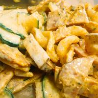 ズッキーニのマカロニサラダのご紹介です。食感が楽しいズッキーニにカレーマヨネーズソースが絡み、やみつきになる一品に仕上げました。マカロニは電子レンジで加熱することで、加熱調理なしでお手軽にお作りいただけます。お酒のおつまみにもぴったりですよ。