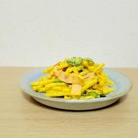 カレー粉の分量はお好みで調整してください。 今回は4分ゆでのマカロニを使用しました。 ご使用の電子レンジによって、水分が残ってしまうことがありますので、しっかりと水気を切ってから調味料を加えてください。