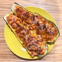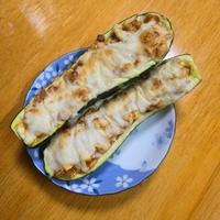 - 2 ズッキーニの器に1を盛り、ピザ用チーズを振りかけて余熱なし250℃のオーブンで15分程焼きます。