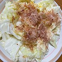 キャベツ4分の1をラップにそのまま包んでレンチン3分。私好みのしなしなキャベツに!かつお節の代わりに白胡麻で代用しました。パクパクっと無くなっちゃう、美味しい一品になりました!