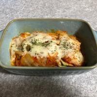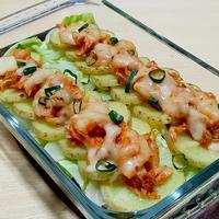 - 2 耐熱皿に1を並べラップをし、600Wの電子レンジで5分加熱します。ラップを外しキムチとスライスチーズをのせラップをせず、600Wの電子レンジでスライスチーズが溶けるまで1分30秒加熱します。