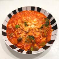 - 4 トマトジュース、(A)を加えて中火で煮ます。ウインナーに火が通ったらオートミールを入れて1分程煮たら火から下ろします。