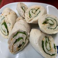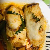 - 3 片面に豆板醤を塗り、1を2枚ずつのせて巻きます。