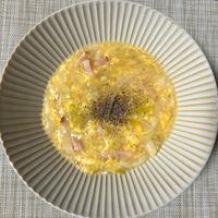 - 7 溶き卵が固まってきたらごま油を回し入れ、火から下ろします。器に盛り付け、粗挽き黒こしょうをかけて完成です。
