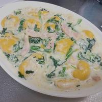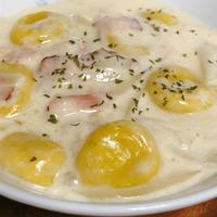 白玉粉で作るトロモチ食感のニョッキです。おやつのイメージが強い白玉粉ですが、オシャレなイタリアン風にもアレンジできちゃいますよ!クリームソース以外にトマトソースやバジルソースとも相性がいいのでおすすめです。