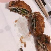納豆が香ばしく美味しかったですが、肉5枚の油少なめで蓋使いながら揚げ焼きにしたら、中の納豆周りが生焼けでした😂4等分にして断面に衣付けて再度揚げました。