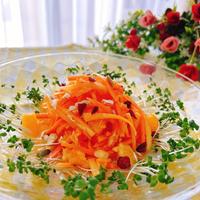 にんじんとオレンジの色あざやかなサラダのご紹介です。オレンジの酸味に、にんじんの甘味とクミンのスパイスがとてもよく合いますよ。お好みでパクチーやセロリなどの香味野菜でボリュームアップさせるのもおすすめです。