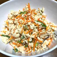 - 準備 木綿豆腐はキッチンペーパーで包み、耐熱ボウルに入れ、ラップをせずに600Wの電子レンジで3分ほど加熱し、水切りをしておきます。