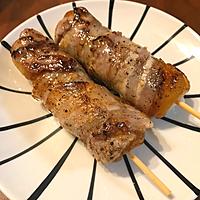 - 4 豚バラ肉に塩、白こしょうをふり、2を3つ刺した竹串に豚バラ肉を巻き付けます。
