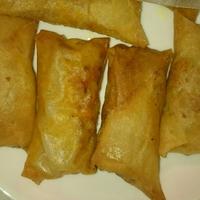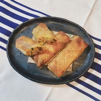 - 6 春巻きの皮で5を包み、巻き終わりを水溶き薄力粉で留めます。