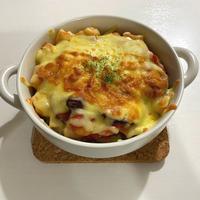 シーフードミックスは湯がいてしまうと身が縮みやすいので自然解凍やお湯で解凍しておくのがオススメです。 トースターはチーズを溶かして、焼き目をつける要因にしたいので、フライパンの中であらかじめしっかり具材に火を通して下さい。 お使いのトースター機種によって焼き加減が異なりますので、様子を見ながらご調整ください。今回は1000W220℃で焼いています。トースターは庫内が狭く、食材と熱源の距離が近いため、加熱中の食材の油が落ちたり、油はねなどが原因で発煙、発火の恐れがあります。加熱中は目を離さないでください。