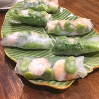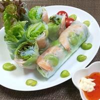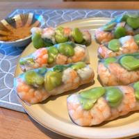 そら豆とエビの生春巻きはいかがですか。ほっくりとした食感のそら豆と、旨味のあるプリプリ食感のエビ、香りの良い大葉とモチモチの生春巻きの皮が、甘辛いたれとよく合いとってもおいしいですよ。ぜひ作ってみてください。