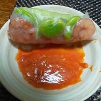 冷凍えだ豆を代用。その他はエビ、カニカマ、大葉、かいわれ大根で作りました。具材が足りなくなって少し焦りました。スイートチリソースでおいしくいただきました。
