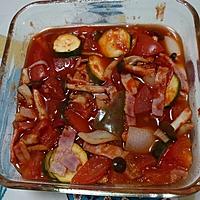 - 2 耐熱容器に玉ねぎ、黄パプリカ、トマト、ナス、薄切りハーフベーコン、しめじ、塩、白こしょうを加え、混ぜ合わせます。ふんわりとラップをし600Wの電子レンジで3分加熱します。