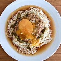 黄身が割れてしまいましたが美味しくできました。少し水と麺つゆが多いような気もします。具材と麺が絡まってよく合います。