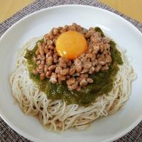 めかぶ納豆そうめんはいかがですか。コリコリとした食感のめかぶと、粘りのある納豆が冷たいそうめんに絡み、とてもおいしいですよ。とろりとした卵黄もよく合います。簡単に作ることができるので、ぜひお試しくださいね。