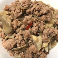 - 4 豚ひき肉に火が通りそぼろ状になってきたら、1と2を加え中火で炒めます。