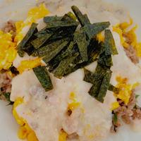- 6 器に2を盛り付け、4を被せるようにのせ、5をかけ、のりを散らして完成です。