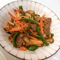- 2 中火で熱したフライパンにごま油をひき、牛こま切れ肉を炒めます。
