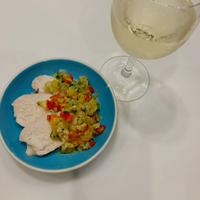 - 1 鶏むね肉を耐熱皿に入れフォークで穴を開けます。塩と白ワインをかけ、ふんわりとラップをかけて600Wの電子レンジで鶏むね肉に火が通るまで5分程度加熱します。