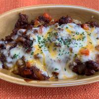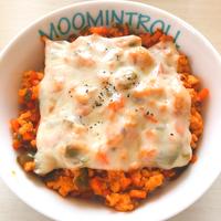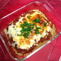 ウスターソースがなく、とんかつソースで代用しました。鍋で茹でたキヌアと挽肉を混ぜてミートソースに絡め、数種類のチーズを乗せて焼きました。