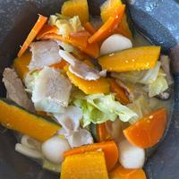 かぼちゃ、にんじん、白菜、豚バラで!うどんは別で茹でた。ほうとうみたいでめちゃ美味しかった🍲