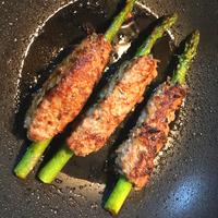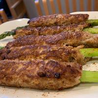玉ねぎは、出来るだけ細かいみじん切りにしましょう。具材を混ぜ合わせる時は、粘り気が出るまでよく混ぜます。その方が、アスパラガスに巻きつけ易くなります。調味料の量はお好みで調整してください!ひき肉も、お好みのひき肉で代用できます。香辛料を入れているため、焦げやすいのでサラダ油を後から入れています。