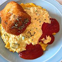 - 9 器に6を盛り付け、その上に8をのせ、5を盛り付けます。1、ケチャップをかけ、パセリを全体に散らして出来上がりです。