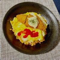 - 6 ケチャップライスを作ります。中火に熱したフライパンに、有塩バターをひき、2を入れてしんなりするまで中火で炒めます。ごはん、(A)を入れて炒め合わせ、味がなじんだら火から下ろします。