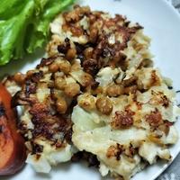 つなぎが入ってないので激しく型崩れしてしまいました😅💦 片栗粉等少し入れた方が焼きやすいかと思います。何も付けなくても味がありましたが、ポン酢をかけたら納豆がさっぱり感じて美味しかったです😊✨