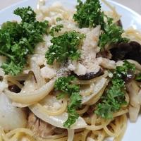 サバ味噌煮缶とクリームソースの意外な組み合わせが生んだ濃厚な一皿です。クリームチーズが味噌の旨みとクリームの滑らかさを見事に調和させ、ゴロゴロとした食べ応えのあるサバの身がアクセントに。しめじやエリンギ、舞茸などのきのこを加えるとボリュームアップ。仕上げに粗挽きコショウや七味をかけると、さらに味が引き締まります。和と洋の絶妙なバランスが楽しめる新感覚パスタです。
