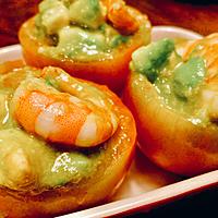 - 4 アボカド、エビ、くり抜いたトマトの中身を合わせマジックソルトをかけさっくり混ぜます