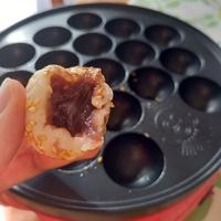 最初は形がぐちゃっとしていましたが、たこ焼き機で焼いていくとまんまるになりました。白玉粉がなくて、上新粉で作ったためにボソボソしてしまいました。次は白玉粉で!