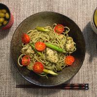 - 5 ジェノベーゼソース、3のスパゲティと茹で汁を加えて混ぜ合わせたら火を止め器に盛り完成です。