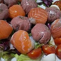 - 3 ラップにスモークサーモン、わさび、1をのせ、包んで丸めます。