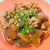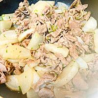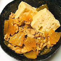 しゃぶしゃぶ用の豚ロース使用。4人分で作り、20分煮込んだ後煮汁がたっぷりあったので豆腐も投入、で5分追加煮。