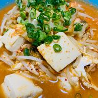 もやし多め、あと豚挽き肉を入れました。私だけ辛いのが苦手なので、粉チーズと牛乳を足したら食べやすくとても美味しかったです!!