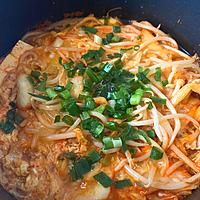 - 3 もやし、キムチを入れて更に5分程、弱火で加熱し、溶き卵を入れます。卵に火が通ったら火から下ろします。