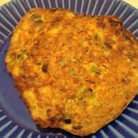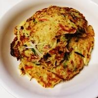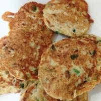 - 4 中火に熱したフライパンにごま油をひき、スプーンで3を8cm程の円形になるよう流し入れ入れ、中火で5分程生地が固まるまで焼きます。