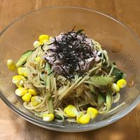 韓国料理のビビン麺を「サラスパ」で作りました。「サラスパ」は通常のスパゲティの半分の長さなので、小さいお鍋でもゆでることができます。ゆで時間も短く、あっという間においしくいただけますよ。コチュジャンの甘辛い味とシーチキンで作ったピリ辛ダレは旨味たっぷりの濃厚な味わいです。「サラスパ」にたっぷりと絡めてお召し上がりください。
