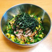 - 5 器に盛り付け、シーチキンLフレーク、シャキッと!コーン、サラのり、マヨネーズをのせて完成です。