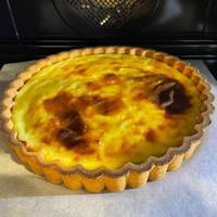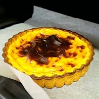 市販タルト(5号)使用、カスタードのみ参考。全材料2/3・牛乳180・ラカント使用、優しい甘さ。カスタードの量を減らしたから焼き時間を減らすはずが間違えて25分近く焼いて焦げてしまった✏️