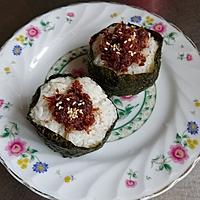 - 4 ご飯を食べやすい大きさに成形し、中央をくぼませ、のりを巻いて3を乗せます。