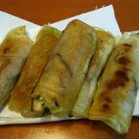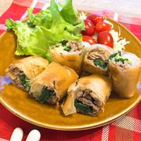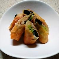 - 5 春巻きの皮に、4、1の順に乗せ、巻き、水溶き薄力粉を塗って閉じます。