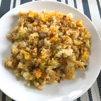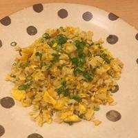 - 2 フライパンにサラダ油をひき、強火で温めます。溶き卵、ごはんを入れて強火で手早く混ぜます。